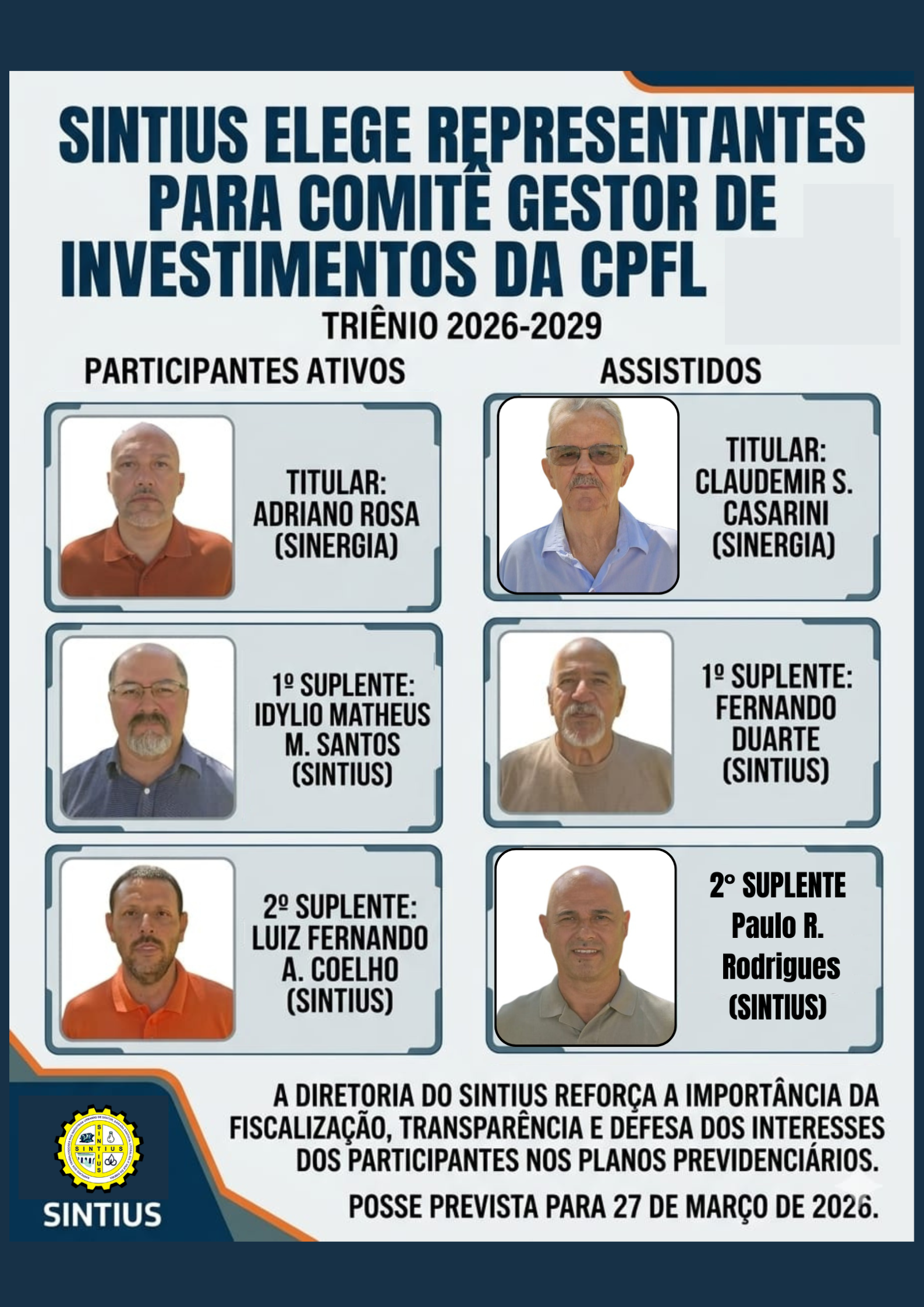 O Sindicato dos Urbanitários (Sintius) terá três representantes no Comitê Gestor de Investimentos e Previdência dos planos PSAP/Piratininga, PPCPFL e CD CPFL, administrados pela Vivest