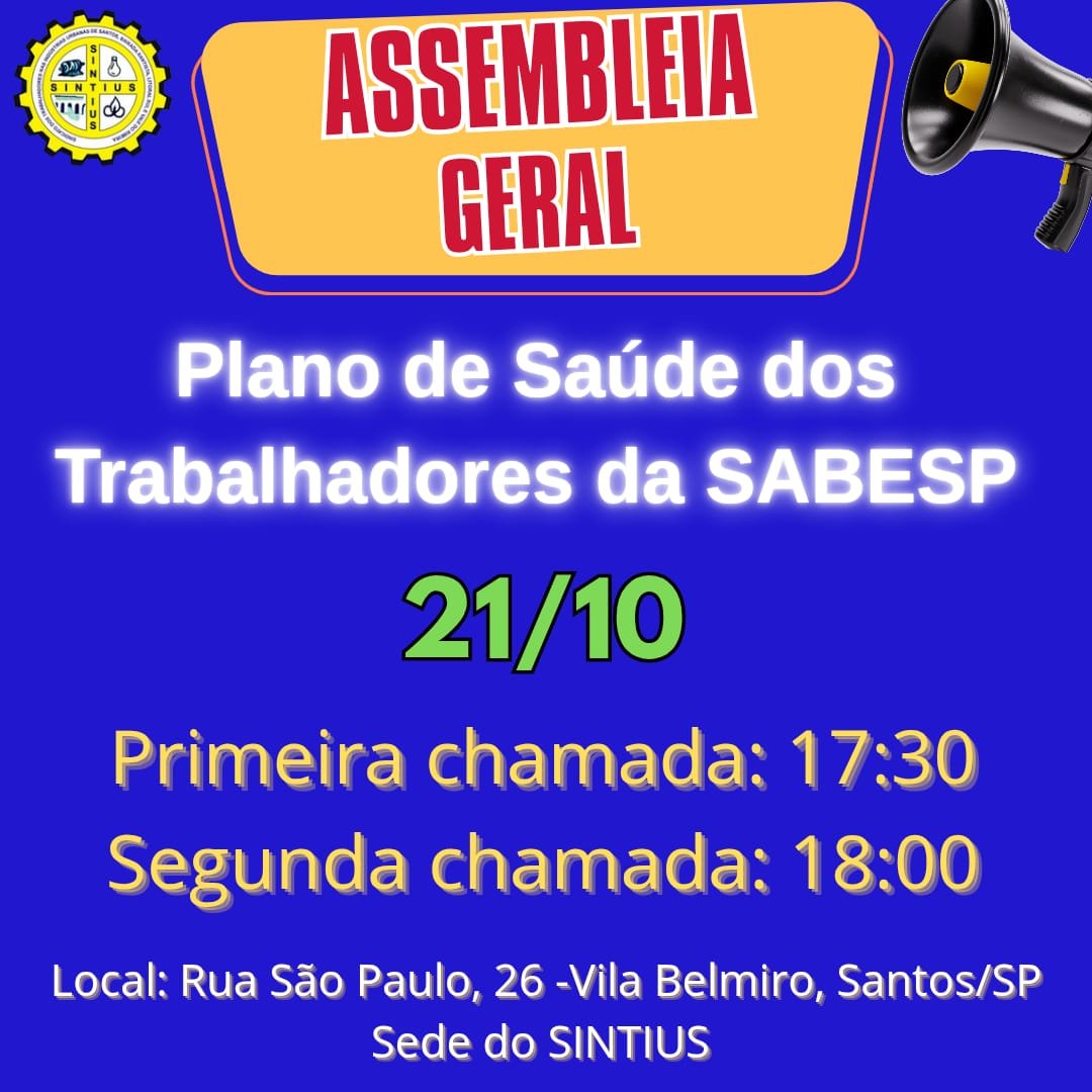 O SINTIUS convoca todos para participarem da Assembleia Geral sobre o Plano de Saúde, que será realizada nesta terça-feira, dia 21/10, na sede do sindicato (Rua São Paulo, 26 – Vila Belmiro, Santos/SP).