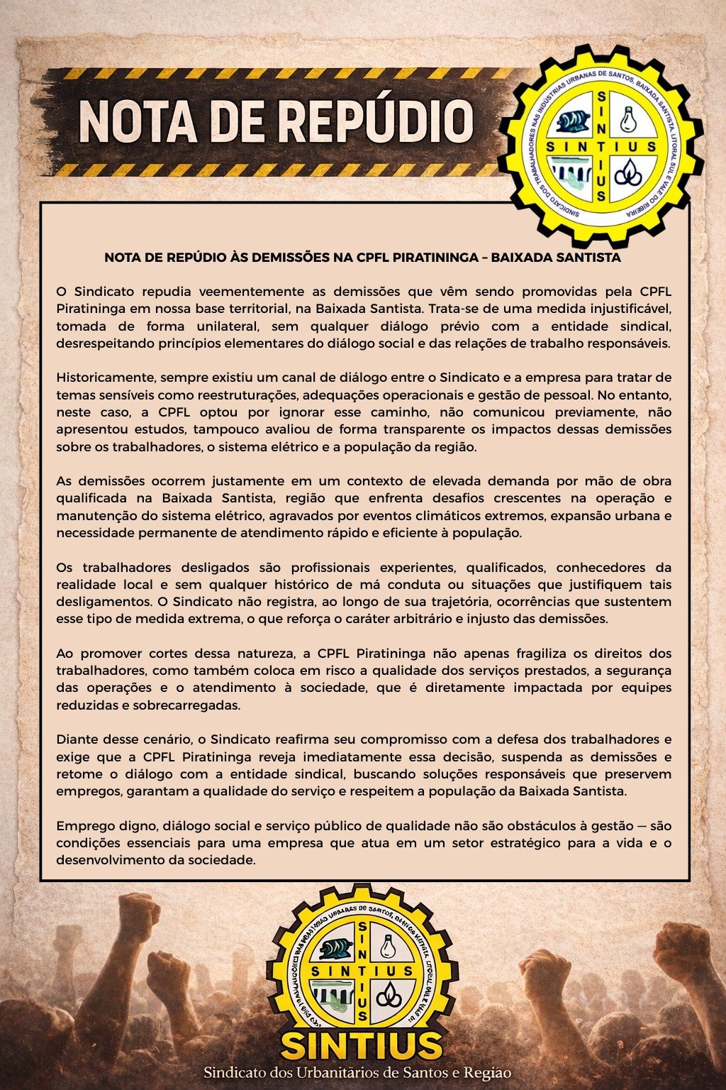 O Sindicato repudia veementemente as demissões que vêm sendo promovidas pela CPFL Piratininga em nossa base territorial, na Baixada Santista.