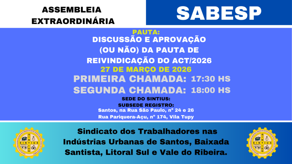 20 mar 2026 Assembleias, Campanha Salarial - Sabesp, Matérias e Notícias Assembleia Extraordinária ACT 2026 – SABESP 20/03/2026 Autor Comunicação Veja mais
