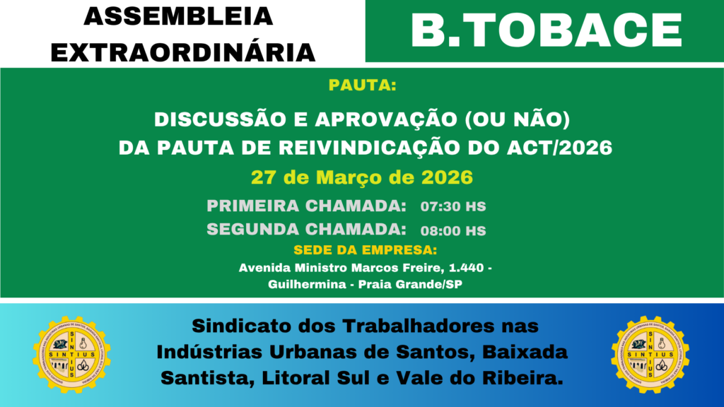 20 mar 2026 Assembleias, Campanha Salarial - B Tobace, Matérias e Notícias Assembleia Extraordinária ACT 2026 / B TOBACE 20/03/2026 Autor Comunicação Veja mais
