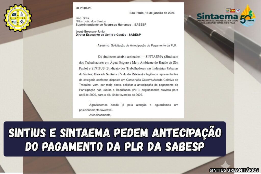 15 jan 2026 Matérias e Notícias Sintius e Sintaema pedem antecipação do pagamento da PLR da Sabesp 15/01/2026 Autor Comunicação Veja mais