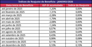 Aqueles que começaram a receber o benefício até janeiro de 2022 terão reajuste de 3,21%. O percentual corresponde à compensação de variações negativas acumuladas em anos anteriores, especialmente em períodos em que o IGP-DI apresentou resultados negativos.