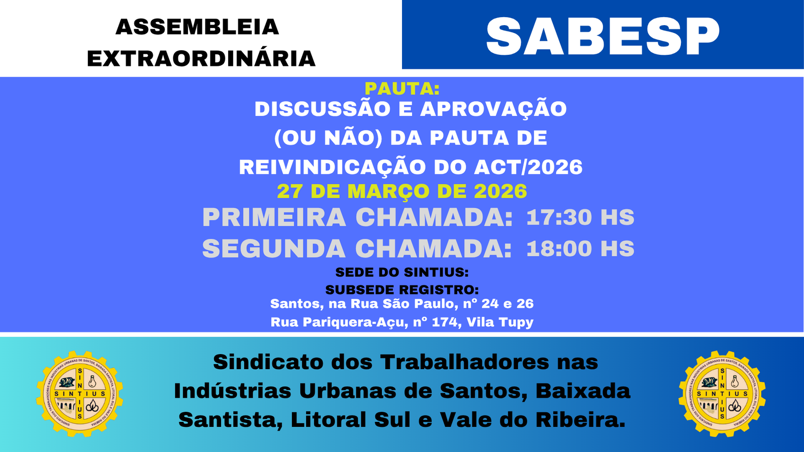 O Sindicato dos Trabalhadores nas Indústrias Urbanas de Santos, Baixada Santista, Litoral Sul e Vale do Ribeira (SINTIUS) ingressou no dia 10 de março de 2026 com uma Ação Civil Coletiva na Justiça do Trabalho contra a CETESB para defender os direitos dos trabalhadores da empresa