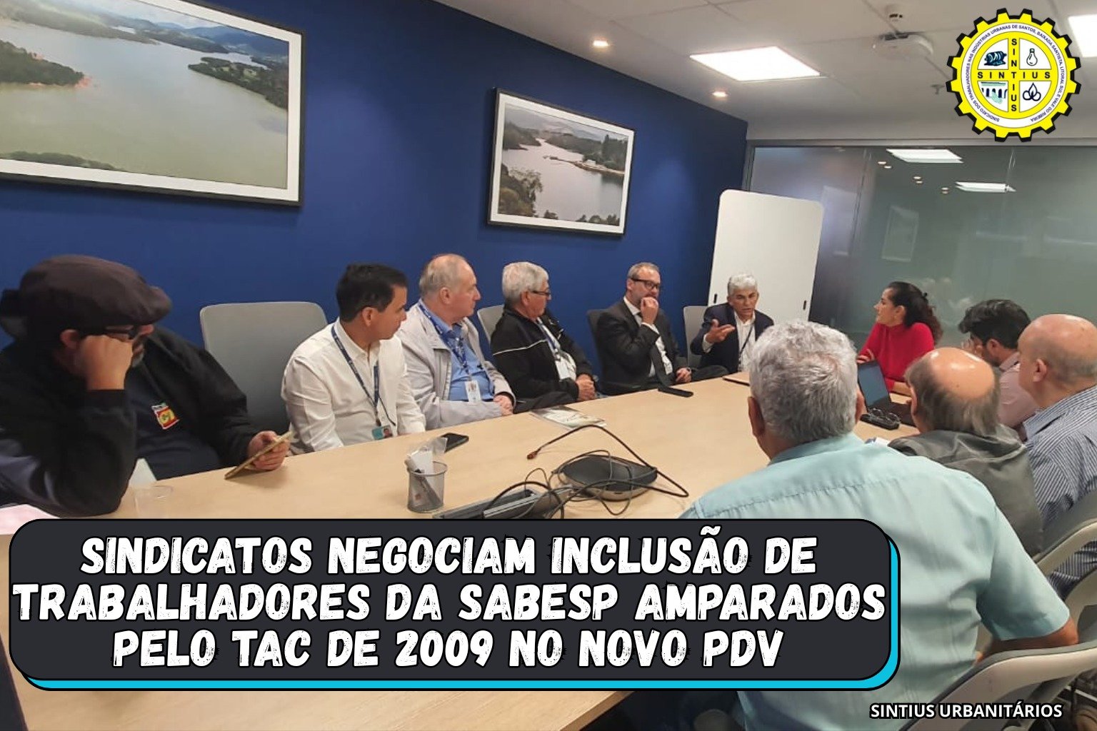 O Sindicato dos Urbanitários (Sintius) e as demais entidades que representam os trabalhadores da Sabesp estiveram reunidos nesta segunda-feira, dia 1º de setembro, com o setor jurídica da empresa, com o objetivo de discutir a situação dos empregados amparados pelo Termo de Ajustamento de Conduta (TAC), firmado em 2009, com o Ministério Público. Atualmente, esses companheiros estão impedidos de aderir ao novo Programa de Demissão Voluntária (PDV).